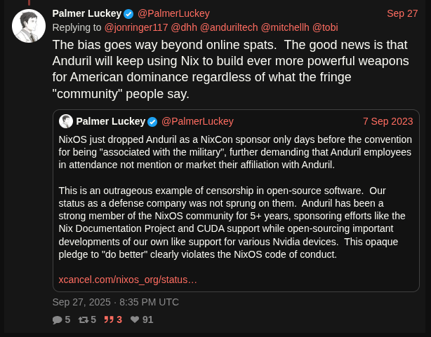 Given this response of *nduril CEO to this particular thread, do you still stand by what you said? Do you really feel, that giving people who want to change the NixOS project to be more effective in facilitating america dominating other countries with their military? With cheeto-in-chief capable only of kindergarten-level zero-sum biggest-stick-win thinking and renaming DoD to Department of War, so that — this is Palmer Luckey again, slightly paraphrased to fit the flow of the sentence — we can get a warrior class excited to enact violence on other in pursuit of good aims? When those “good aims” is literally dominating the world?