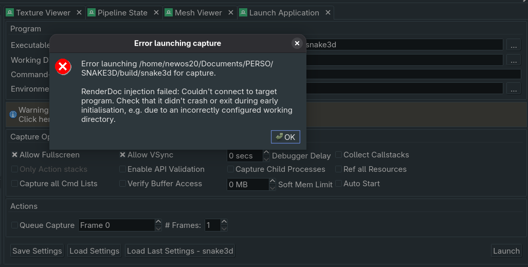 I think that this is renderdoc throwing the error, since launching the application without it works just fine, but I’m not completely sure…
