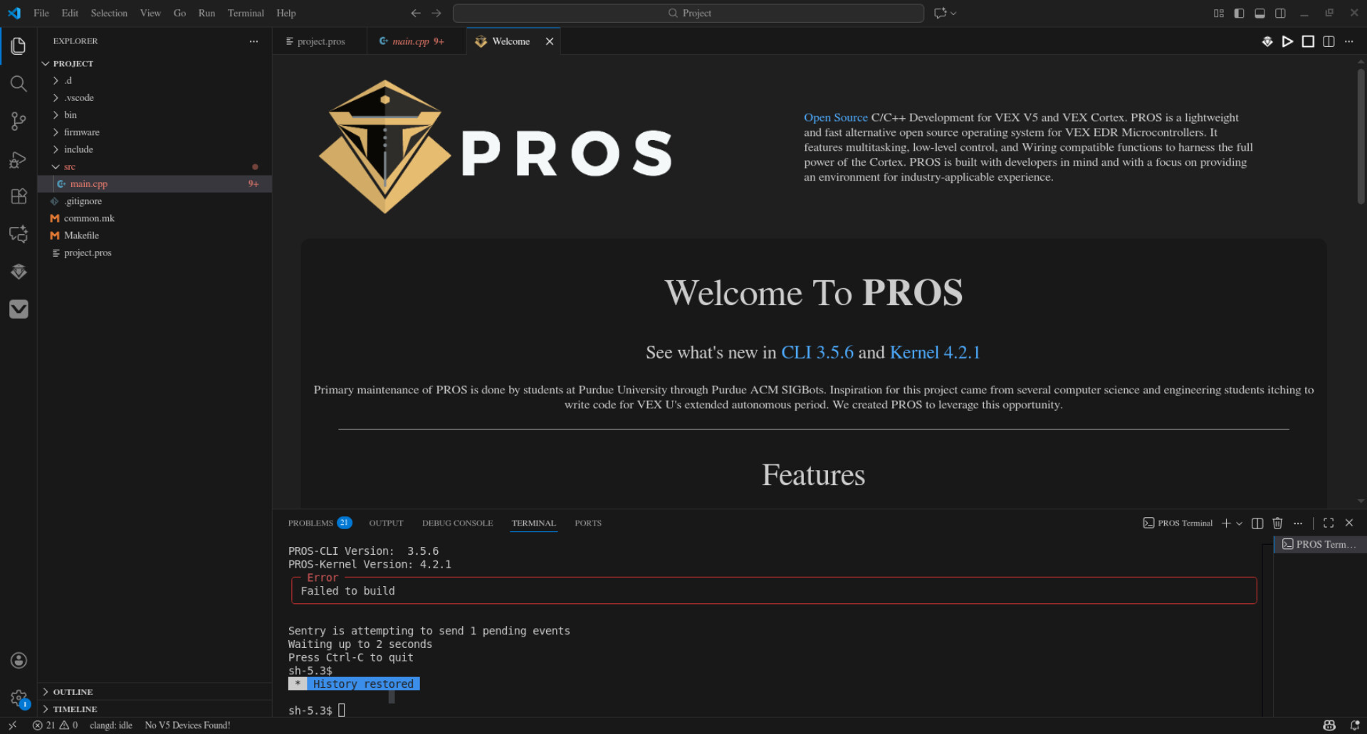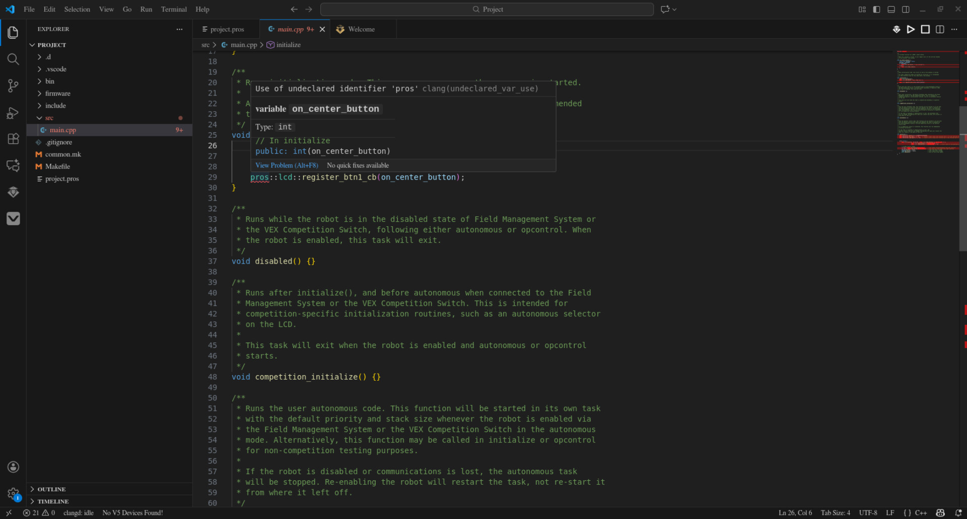 Hello. I am trying to program for my Robotics team on my laptop, and we use Visual Studio Code with the ‘PROS’ Library for C++ (which has everything we program with). Whenever I look main.cpp, all of the functions & otherwise given to me by the library are said to be undeclared. I am sure this means it is not working somehow.