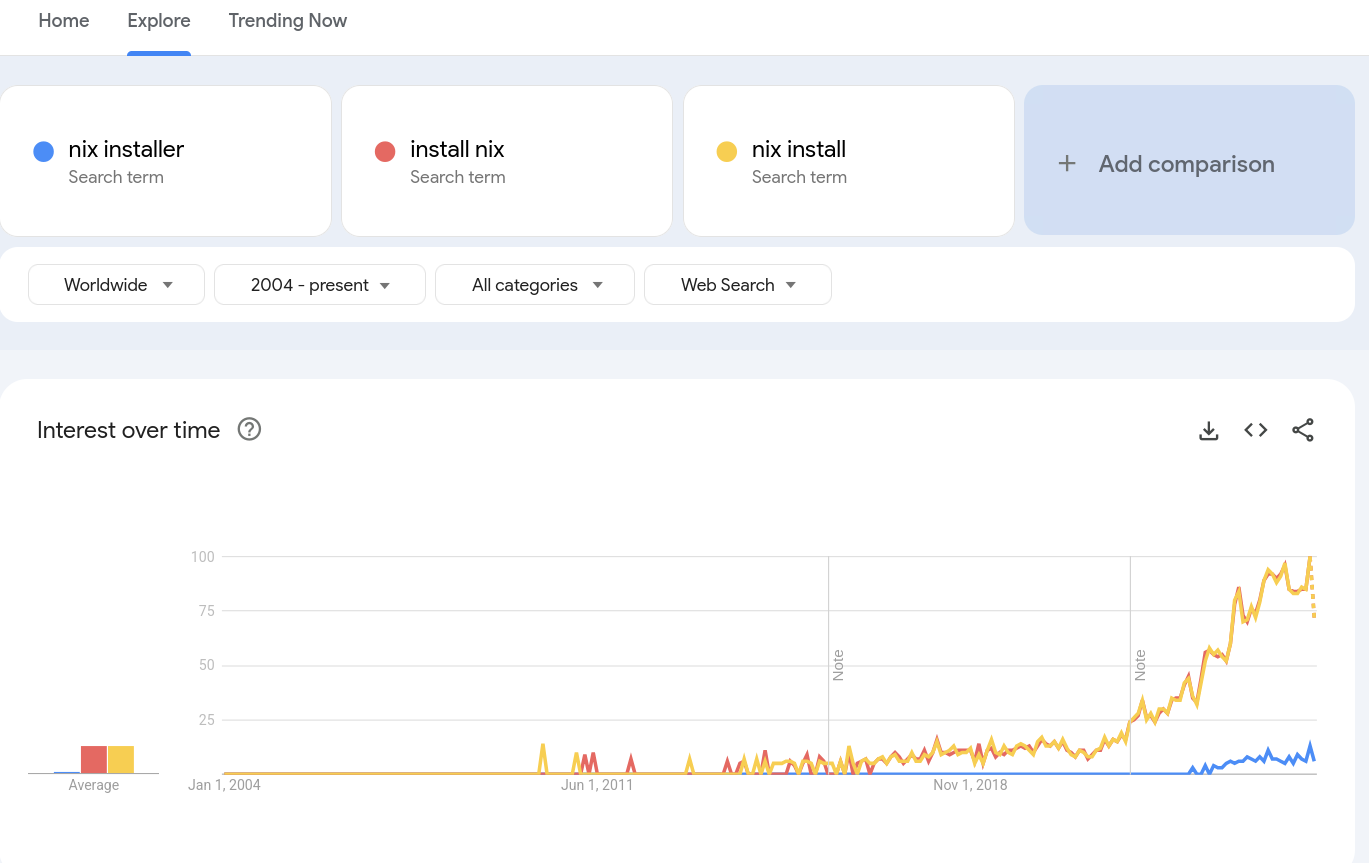 Nobody looks for linux installer, ubuntu installer, nixos installer, x installer. it is almost always install x or x install. (google trends, google trends, google trends)
