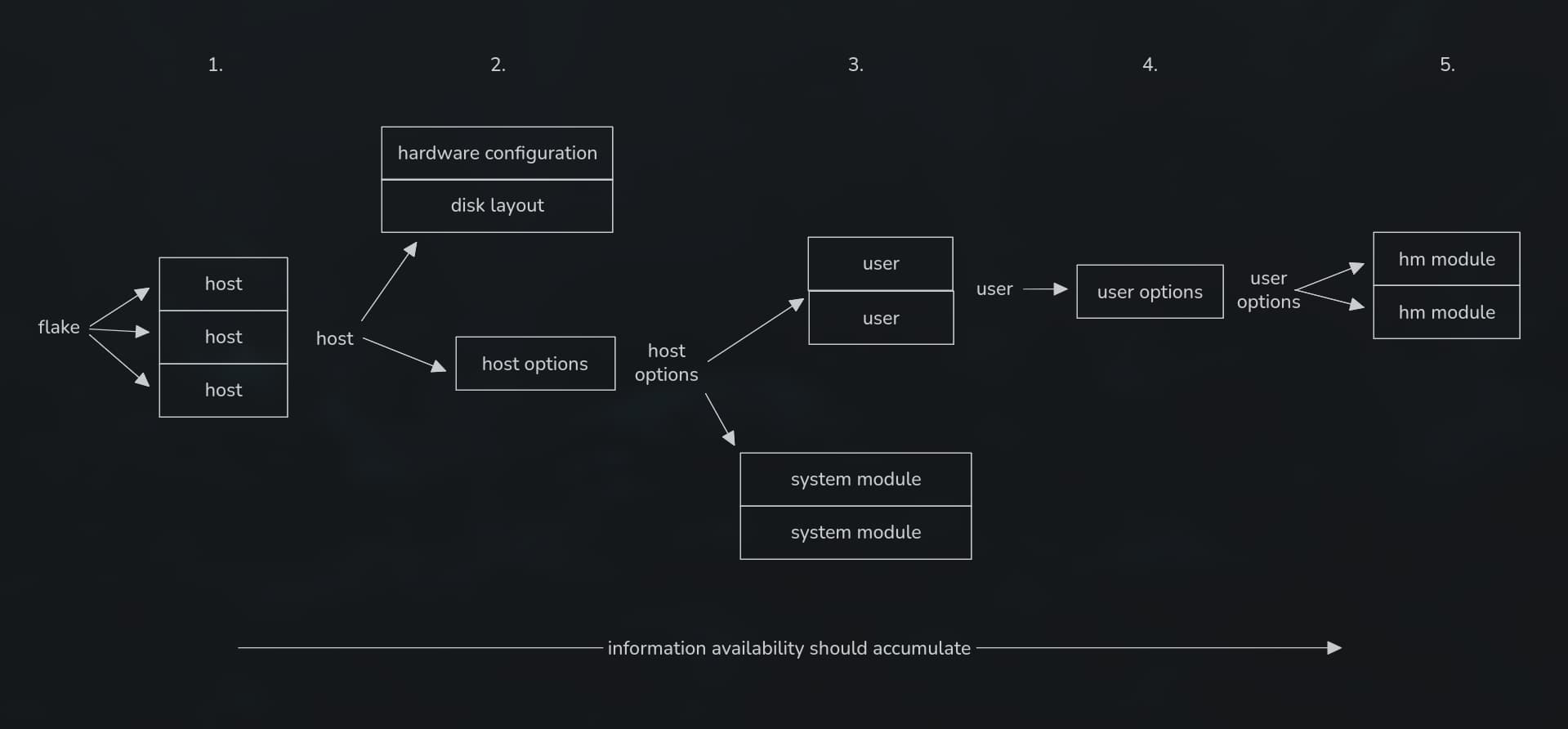 I want to unnest as much as possible by enforcing the way modules are imported into the config. The flake imports hosts, which in turn import users, which in turn import modules. The modules at the end of this chain should be able to access information declared by the hosts that import them; the hosts should not need any awareness of its users.