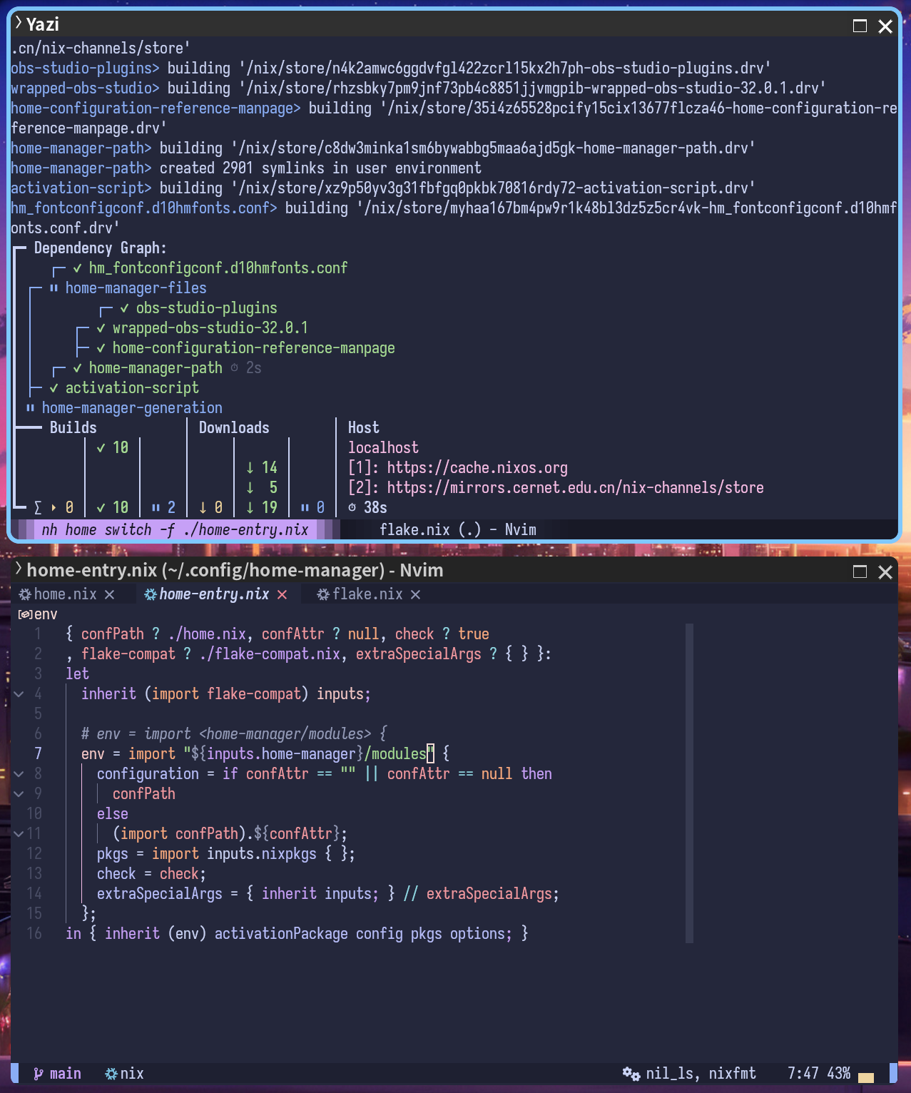 home-entry.nix is modified from the nix function <home-manager/home-manger/home-manager.nix>. In simple terms, when not using flake, home-manger switch simply uses nix-build to build the activationPackage property returned by the nix function. This nix function accepts home.nix (usually) as an argument. This nix function is a wrapper of <home-manager/modules>.