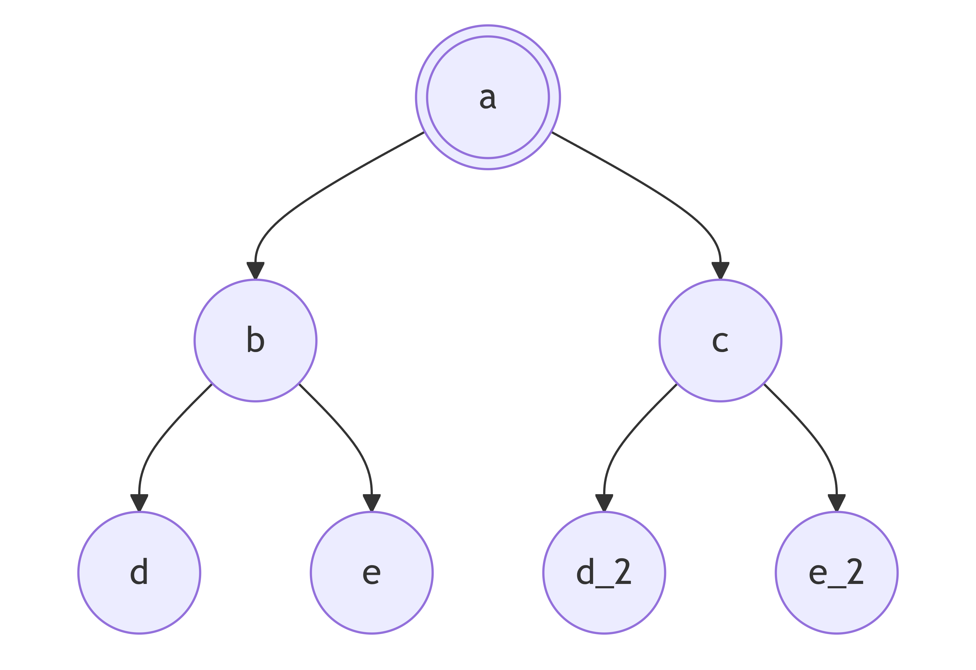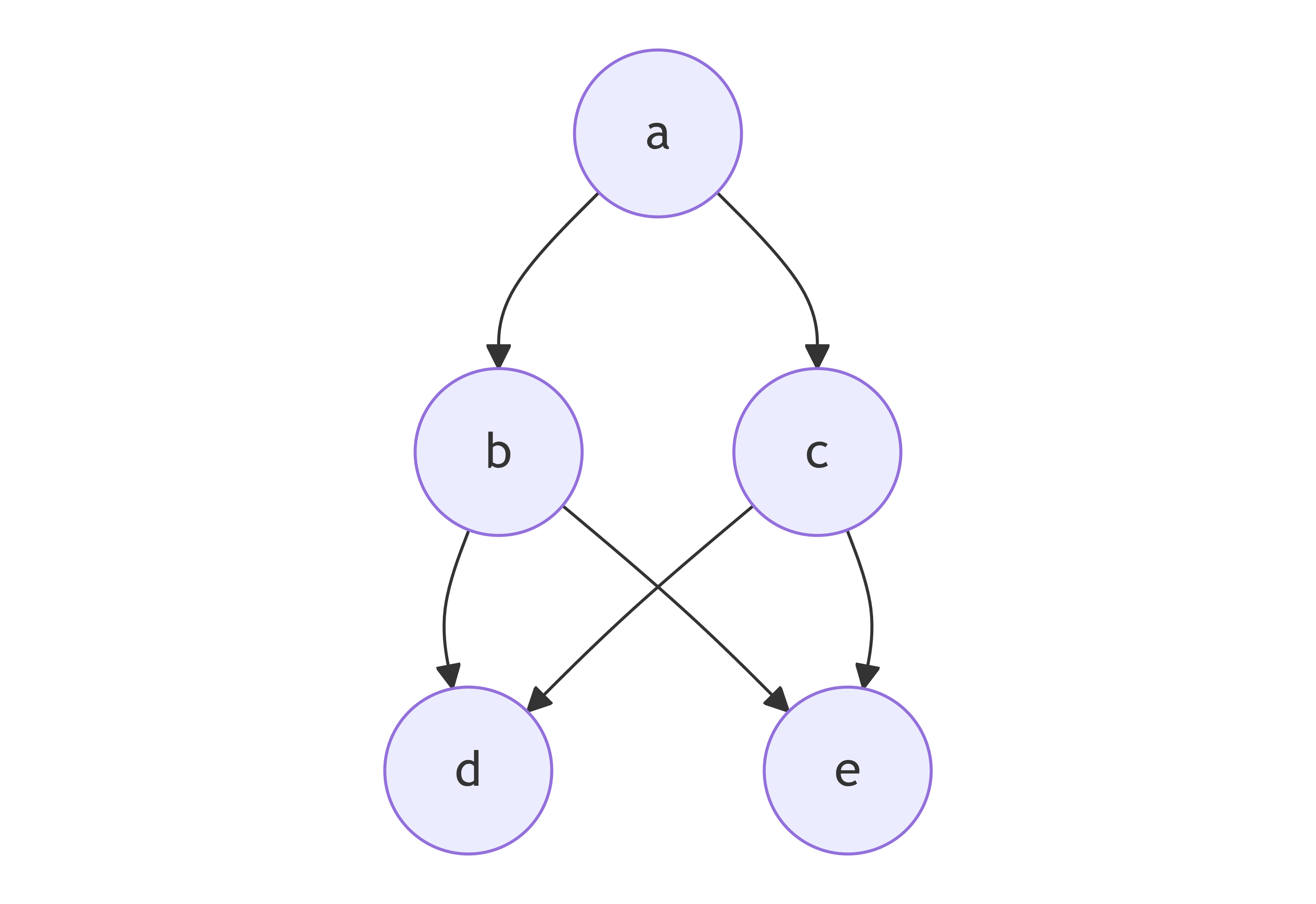 A user’s natural expectation would be that the final dependency graph would only contain one instance of d and e. Instead, flake.lock from the perspective of a looks like this: