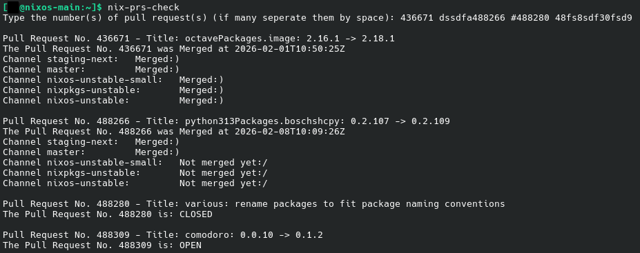 nix-prs-check = "read -r -p \"Type the number(s) of pull request(s) (if many seperate them by space): \" prnumbers && ~/dotfiles/.config/nixos-config/modules/non-nix-scripts/bash-scripts.sh nix-prs-check $prnumbers && unset prnumbers";