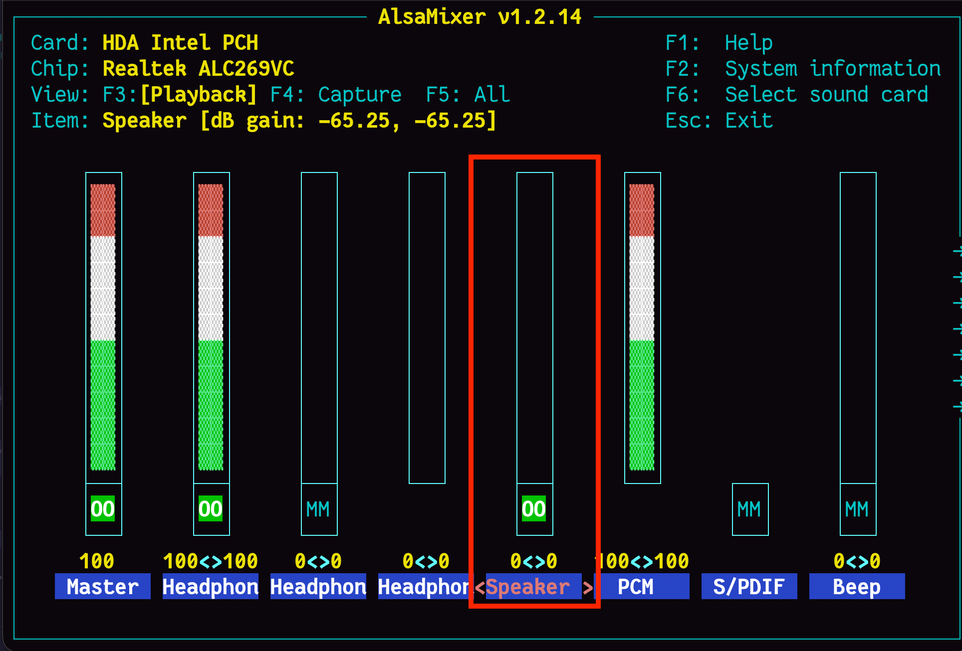 If I go down and select the real sound card, default:0 HDA Intel PCH, I can actually see the channels. However, I then need to unmute the Speaker channel (muted by default).