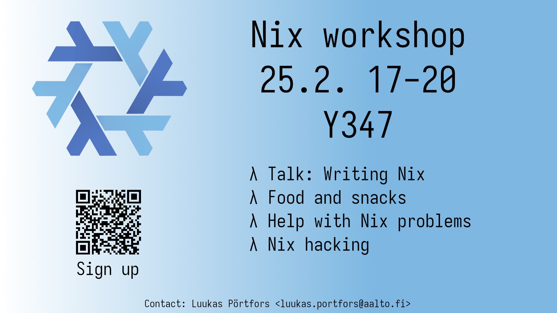 Last minute announcement! Wonderful people at OtaNix Ry are organizing a Nix Workshop at the Aalto University this 2025-01-22T13:00:00Z→2025-01-22T16:00:00Z. People of all backgrounds and levels expertise are welcome. The event begins with introductory talks and proceeds with hands-on sessions. Experienced Nixers are also encouraged to join for hacking, networking, supporting new enthusiasts, reviewing and merging PRs during the hands-on. Sign up at https://forms.gle/dcQU1Ggj1DPNP5sN6