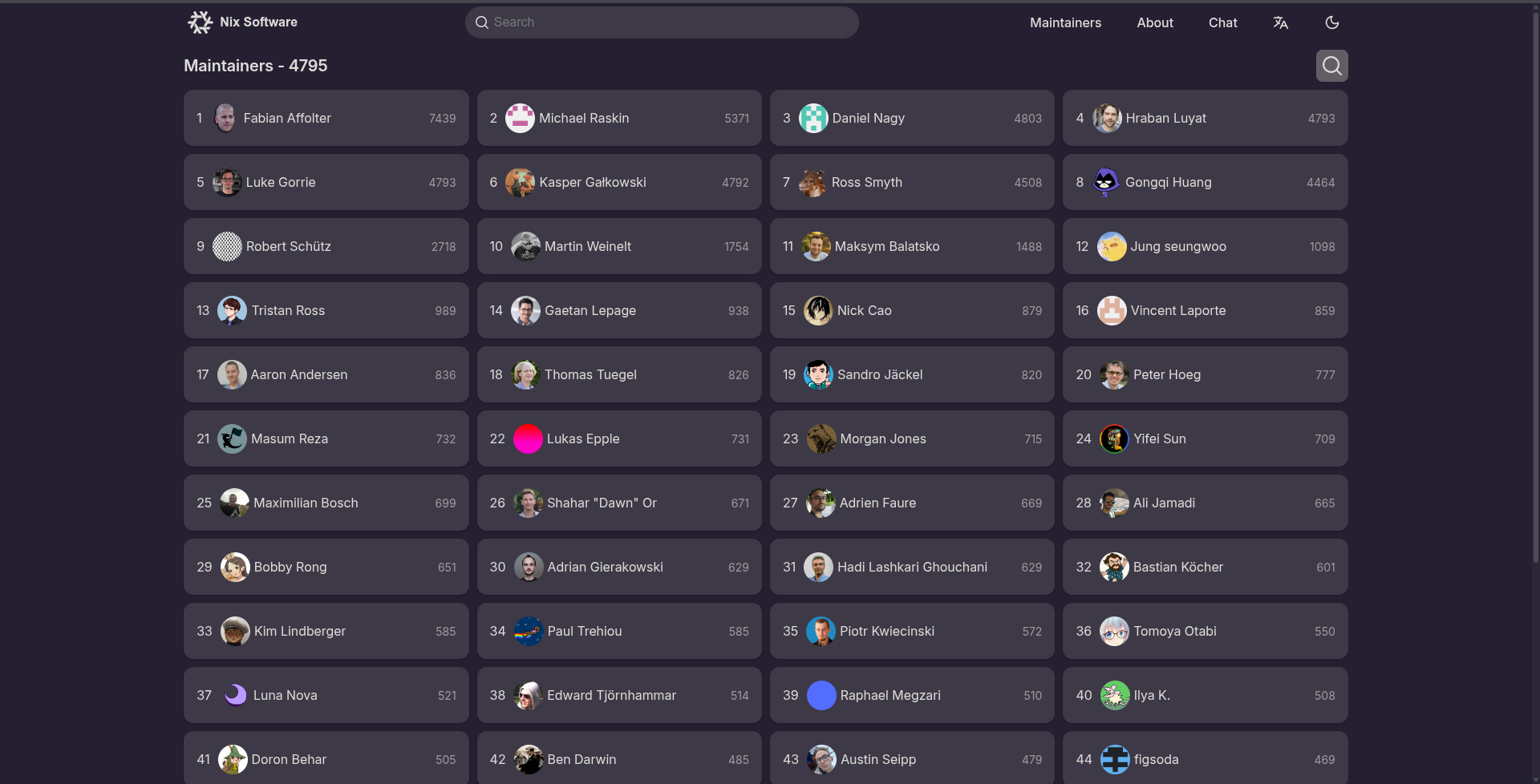 Due to dissatisfaction on Reddit, maintainer sorting has been disabled. The ordinal number and the number of packages for each maintainer are no longer counted.