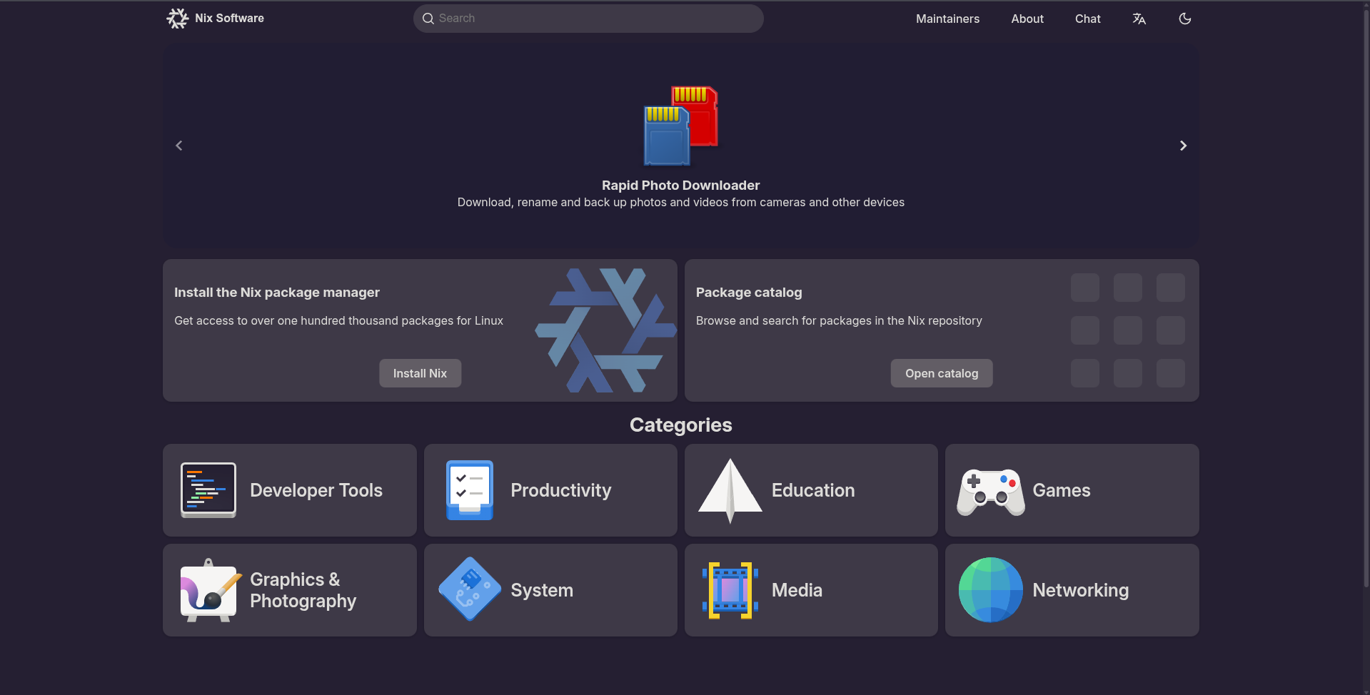 Now the homepage greets users with a new design. The slide content updates every 3–4 days. New users can more easily navigate directly to the category they need. (I took the category icons from Gnome Software, I hope that’s legal.)