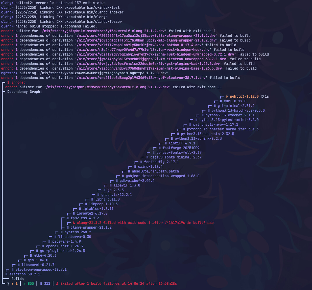 Now it does build a good chunk of nixpkgs (master), almost all packages tags that are exposed by recursionMode = "hydra", and builds on x86_64-linux. Note that i use substituters and a timeout of ~30s per derivation to make it manageable to build within a bit more than a day. I’m not exactly sure on which frequency i will put the job on as i got some more experimentation to do with it, probably 2 days to once a week.