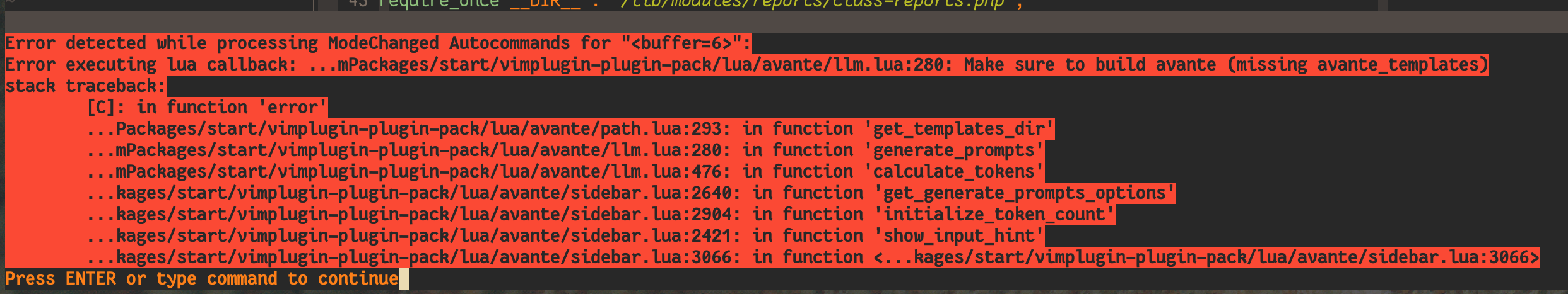 Error executing lua callback: ...mPackages/start/vimplugin-plugin-pack/lua/avante/llm.lua:280: Make sure to build avante (missing avante_templates)