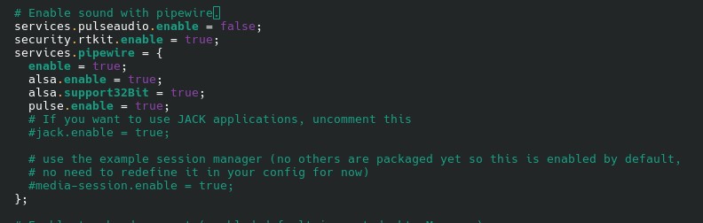 The pipewire declaration in my configuration.nix created by the installer appears to be exactly as it should be. Although new to Linux, I have programmed on UNIX (mainly AIX) for many years, but only have limited sysadmin experience. This ought by rights to be something really simple, but I can’t for the life of me see what it is! Any help will be much appreciated.