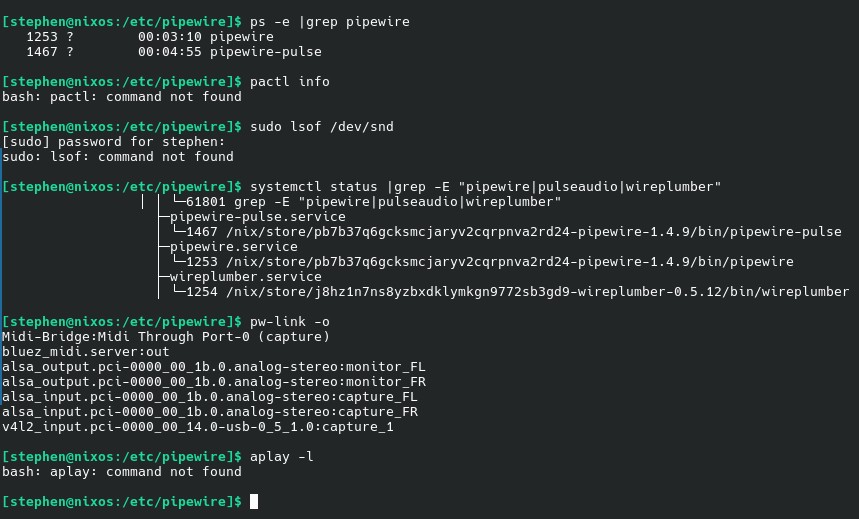 As can be seen above, I appear to have pipewire services running, but the commands that I need to follow the relevant threads (such as ‘aplay’) are not available to me. I have searched for an ‘aplay’ file on the system, (a possible pathing issue) but haven’t found one.