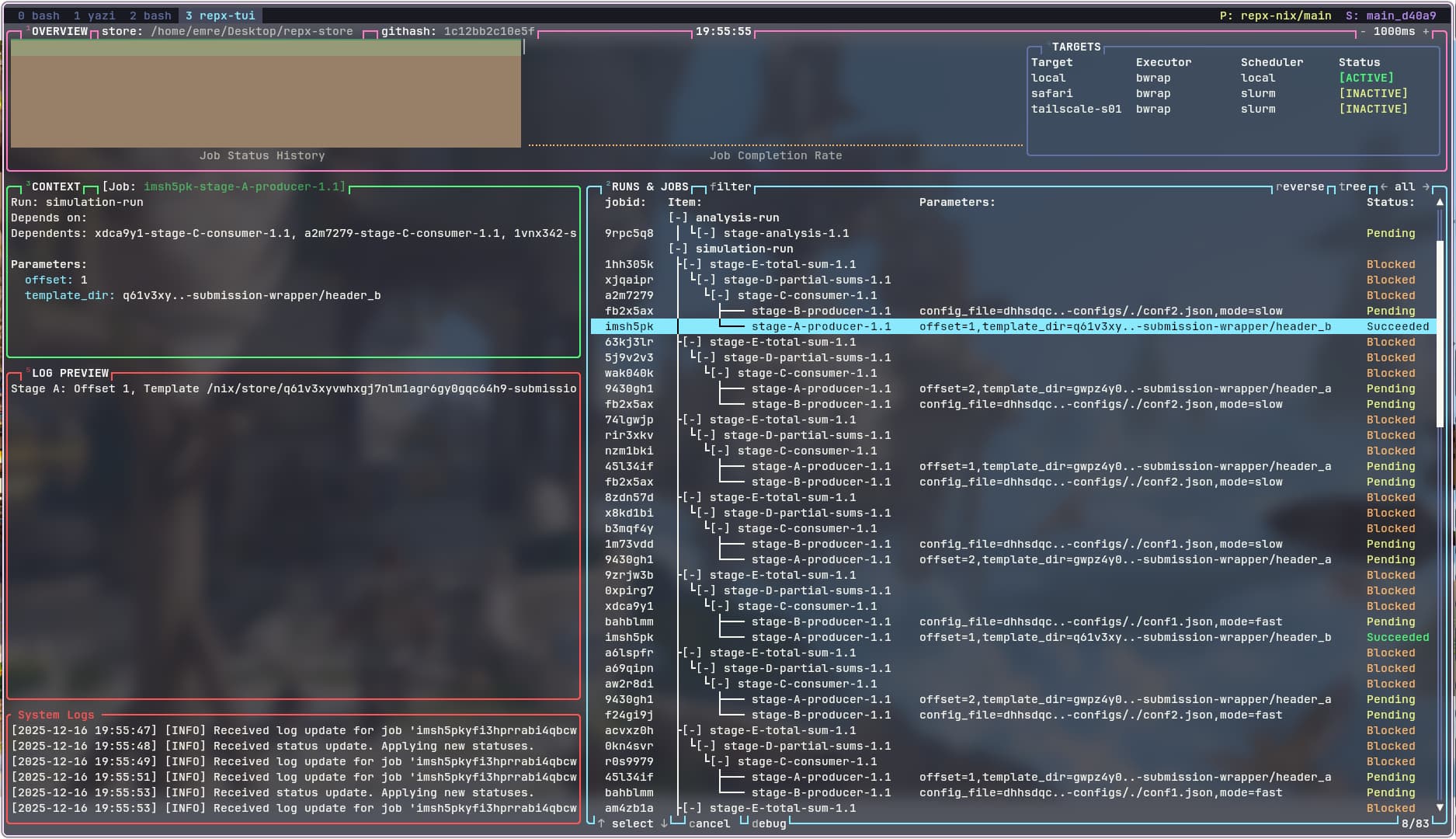 repx-runner(written in Rust) handles syncing the closure and executing jobs inside isolated containers (using Bubblewrap or Podman) derived from that closure. It supports content addressable caching and slurm scheduler.