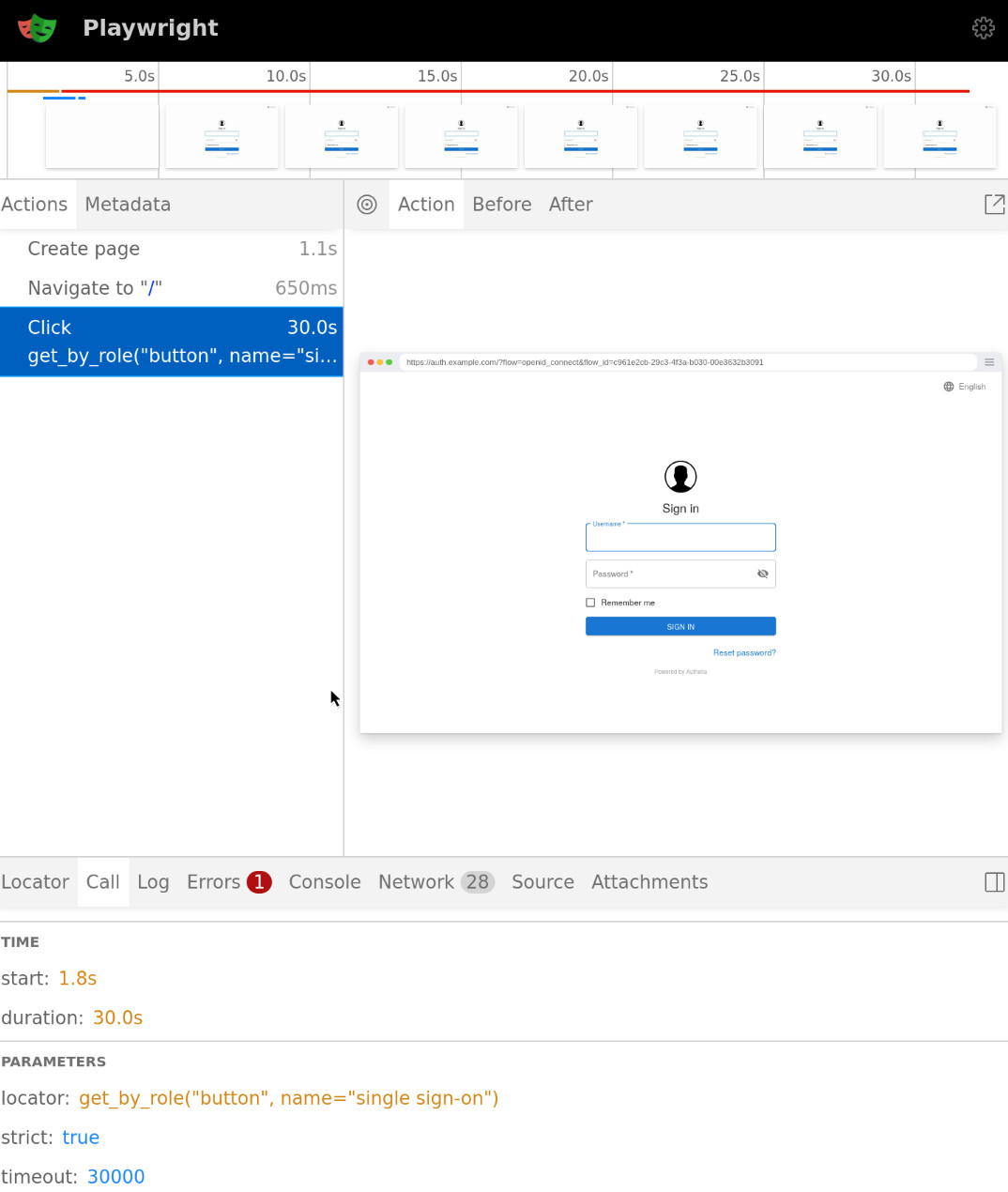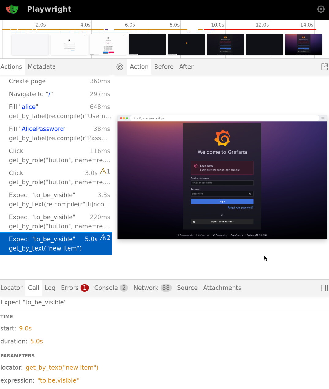 Something else that could fail is the interaction between Authelia and Grafana. Here, the Playwright debug output is not useful anymore: